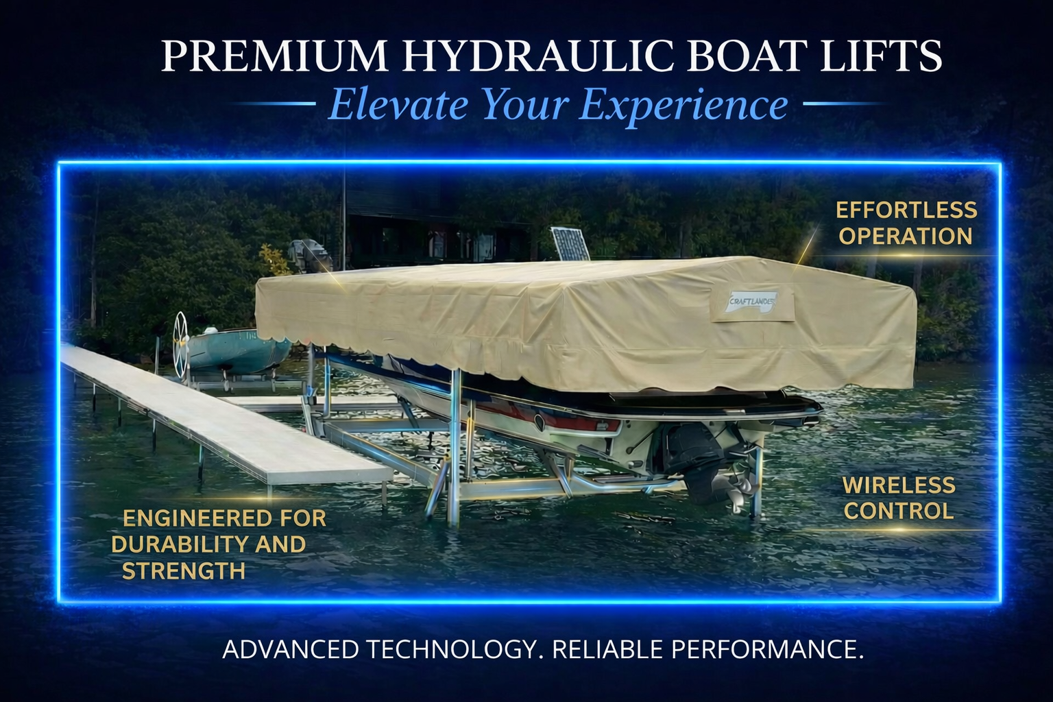 Strength. Speed. Silence. CraftLander hydraulic-driven vertical cable lifts deliver massive lifting torque, fast cycle times, and smooth cable control for serious boats and shorelines.